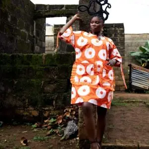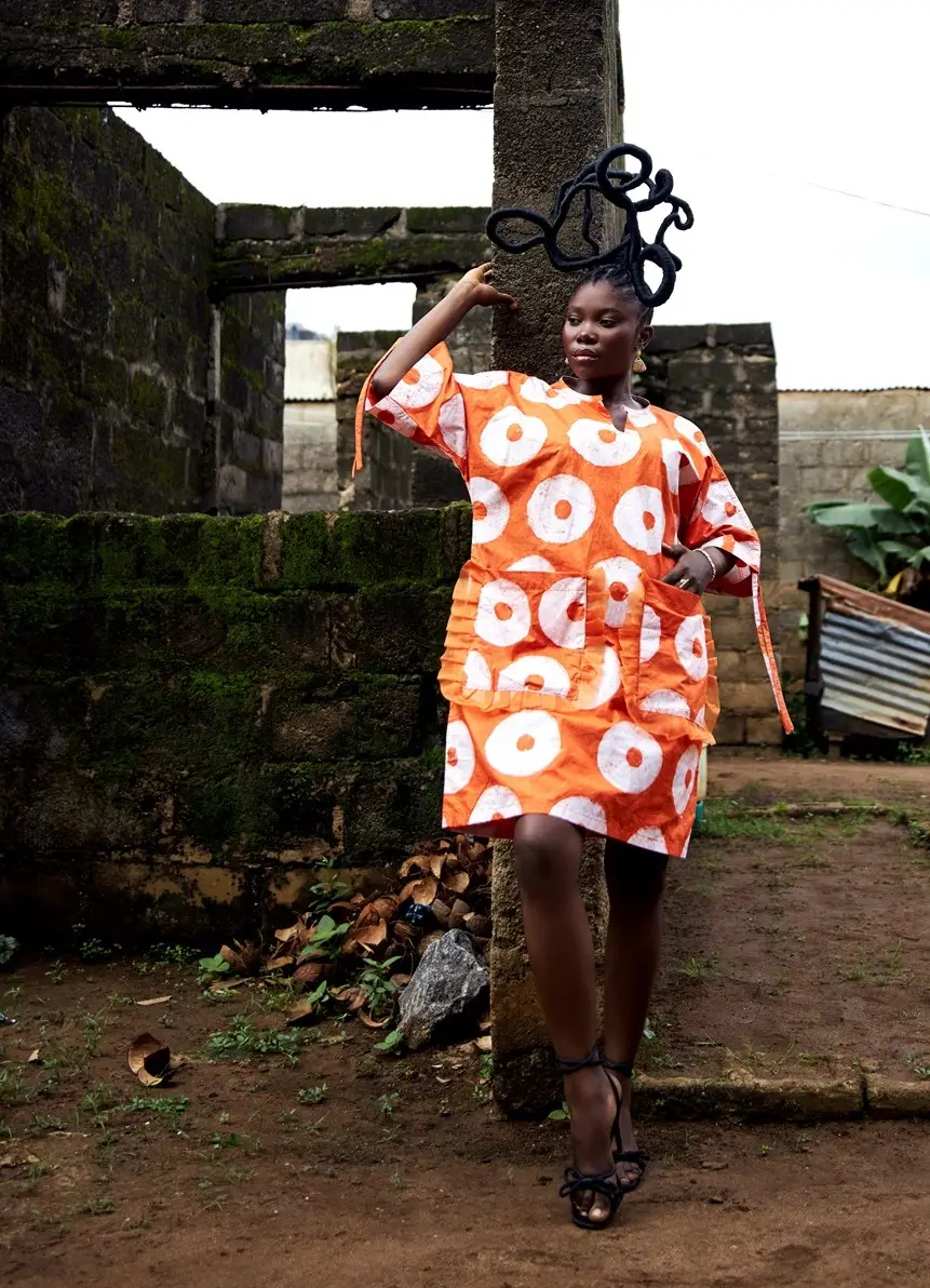 The Adesuwa Short Dress is crafted from batik adire, the Yoruba art of resist-dyeing,where every circular motif is hand-made with cultural rhythm and meaning. Its bright orange palette radiates joy and confidence, making it a striking expression of heritage in motion. Two front pockets add ease and balance, while delicate organza rope details on the sleeves bring a playful, modern twist.
