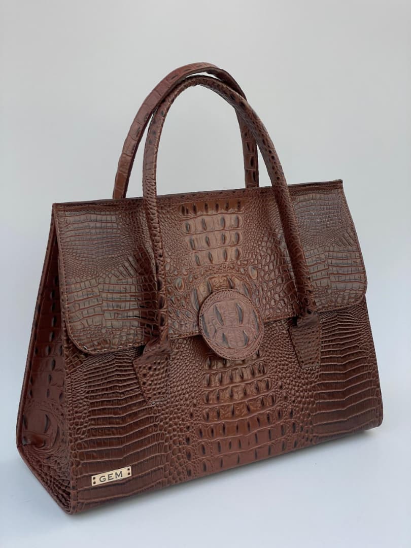 The Cognac Classic Tote by GEM embodies timeless sophistication and modern functionality. Expertly crafted from crocodile-embossed vegan leather in a rich, warm cognac hue, this structured handbag is designed for the woman who values elegance in every detail.